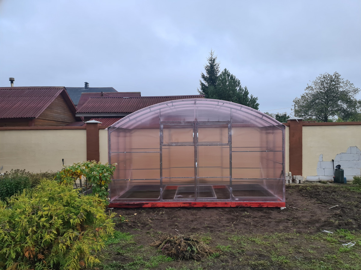 • широкая 4 м, ширина теплицы позволяет организовать 3 широкие полноценные грядки с комфортными проходами между ними;